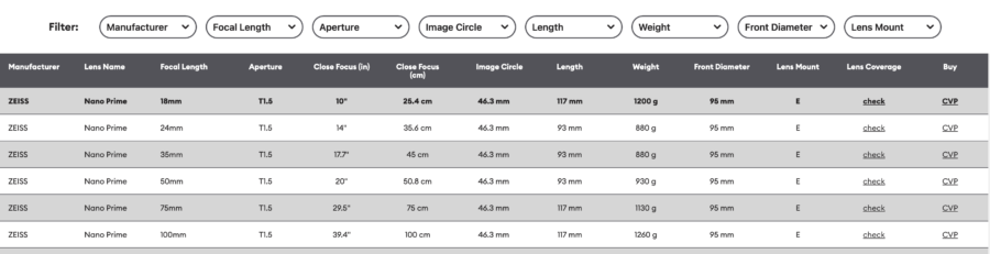 CineD Lens Database screenshot showing the new ZEISS Nano Primes (click here).