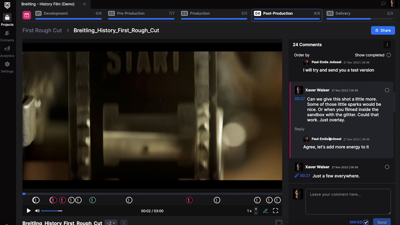 Extensive communication is another big pain point in our industry that PRODUCER – Maker Machina wants to resolve. The software allows users to add comments to each document and at every production stage. Your clients can also collaborate whenever needed. For example, in the post-production section, it is possible to upload your first cut and share it for quick feedback. Additionally, you can compare different versions of the edit side by side, directly in the software.