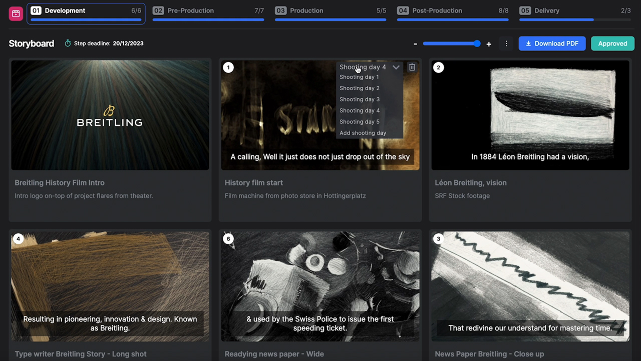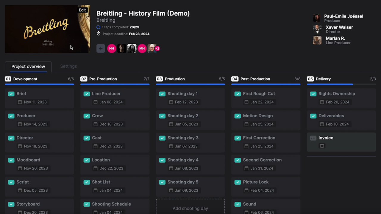 The idea for an all-in-one production software came to Xaver during a commercial shoot for a watch brand. The client asked him if they could have all the created content, shooting schedules, and feedback notes in one place. Regrettably, the filmmaker had to acknowledge that he had never come across such a comprehensive tool. That was the first step toward founding a start-up with precisely this goal: to give creatives an all-in-one application for managing productions from early concept through to delivery. Or, as Xaver Walser nicely puts it: “To make a painkiller for filmmakers.”
