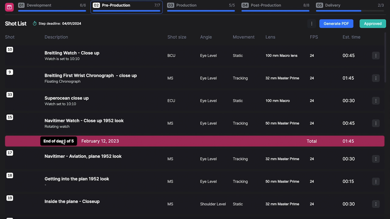 While you’re going through this process, the software automatically creates a shot list for each day based on the information you’ve provided. Simply make the final adjustments by dragging shots into the desired sequence (e.g., for consecutive shots), include the estimated time, and let the program do the math. Double-check, connect the actors from the list to the character roles, add your crew members for this project – and, wait, what? Has PRODUCER – Maker Machina just generated a correct call sheet?