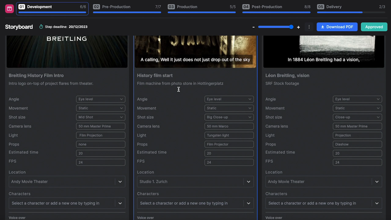 Apart from moving them around until you get the correct storyline, you can connect each of your pictures to a shooting day, a location (from the list you created before), and characters. Also, it’s easy to collaborate with a cinematographer, adding additional information such as angle, movement, shot size, camera lens, etc.